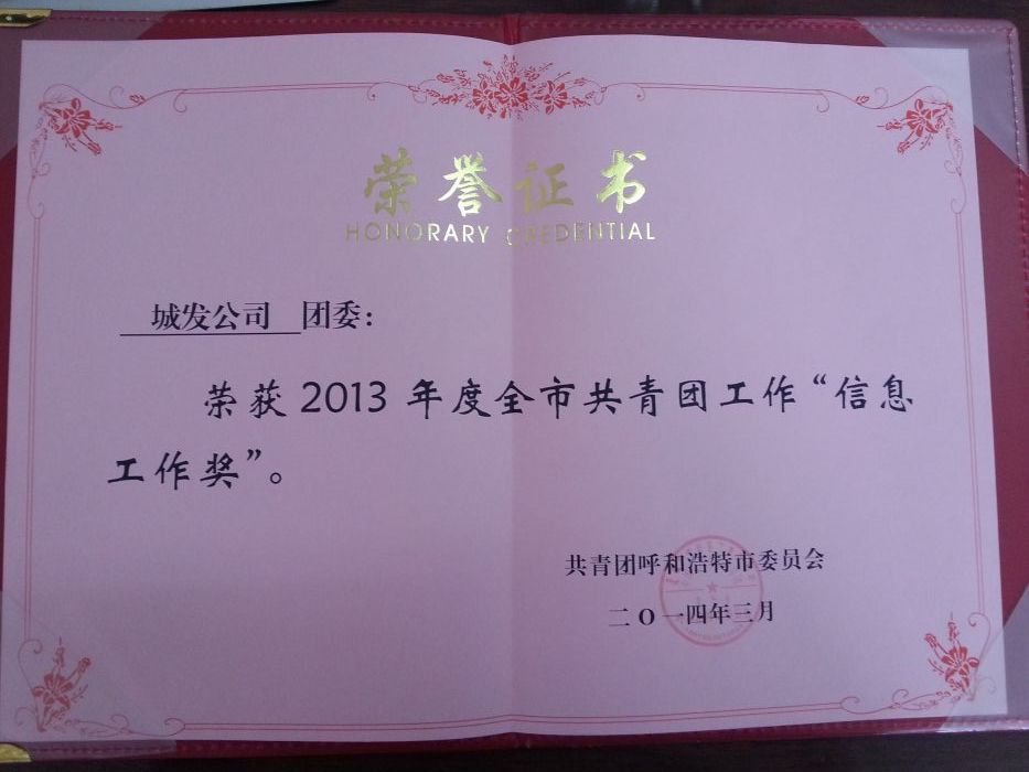 2014年3月14日,公司團委獲得2013年度全市共青團工作“信息工作獎”。