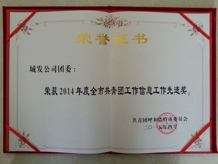 2015年4月3日,在共青團呼和浩特市十六屆二次全委(擴大)會暨少工委五屆五次全委(擴大)會議上,城發(fā)公司團委榮獲“2014年度全市共青團工作信息工作先進獎”。