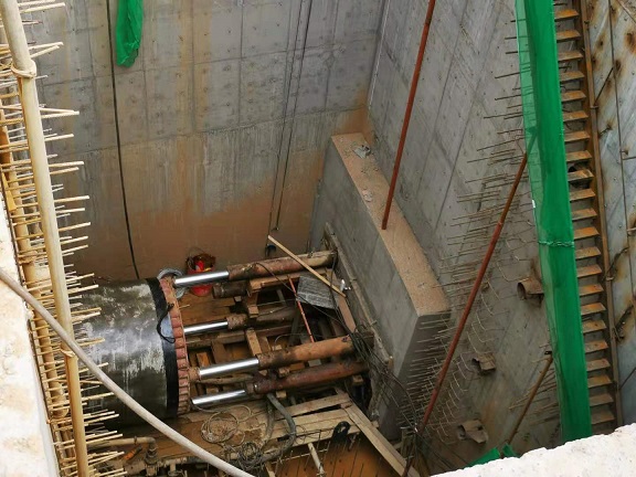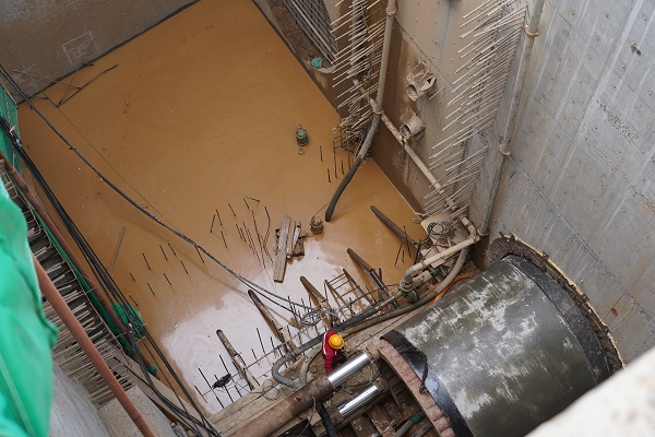 施工現(xiàn)場機器轟鳴,說話需要提高分貝。一進入施工現(xiàn)場,就看到前方有一個沉井,沉井20米深、13.4*7.3米間方,這個沉井是挖掘井,在河的對岸還有一個深15.5米的接收井。從沉井圍欄邊看井底,下邊的工作人員都顯得特別的渺小,20米深的井相當(dāng)于6層樓高,恐高的人都不敢往下看。