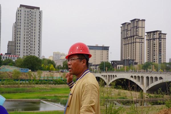 筆者來到成吉思汗大街與哈拉沁路交匯處的路口,遠遠就看見一臺重型吊車矗立在工地圍擋中,圍擋內(nèi)就是跨越東河頂管工程的施工現(xiàn)場。