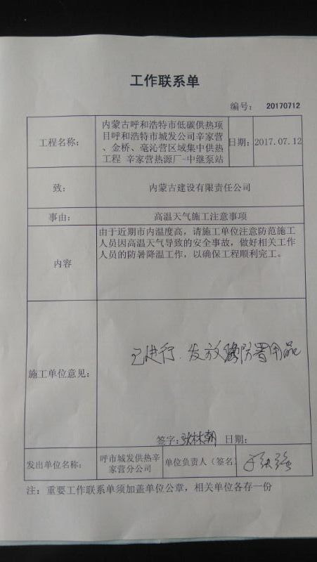 為此,工程自3月31日開(kāi)工以來(lái),全體參加建設(shè)的單位和個(gè)人,克服種種困難,加班加點(diǎn),在保證安全和質(zhì)量的前提下,為確保今冬按時(shí)投運(yùn)而努力施工;尤其是近日持續(xù)高溫以來(lái),為既能確保施工人員的安全,又能確保工期不后延,施工方采取了早上工,晚收工,午增加休息時(shí)間,給施工人員熬制防暑綠豆湯等辦法,從而保證了施工有效時(shí)間,確保工期沒(méi)有任何延誤。同時(shí),我分公司為保證暑期施工人員安全,及時(shí)給施工單位下發(fā)了《工作聯(lián)系單》,對(duì)高溫天氣施工提出要求,并要求施工單位有具體防暑措施。