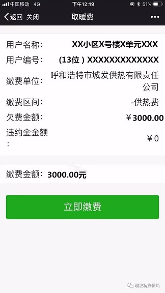 為確保廣大熱用戶安全交費(fèi),請務(wù)必按照下述正確操作流程進(jìn)行交費(fèi),不要通過其他公眾號或個(gè)人生成的二維碼等平臺進(jìn)入交費(fèi)界面。按照正規(guī)通道進(jìn)入微信平臺交費(fèi)界面(無歷年欠費(fèi))操作流程如下:
