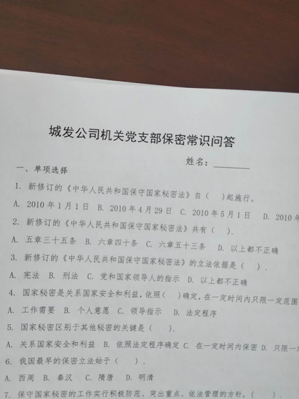 還集中進(jìn)行了保密教育。為進(jìn)一步推動(dòng)保密和密碼工作現(xiàn)行方針、政策、法律法規(guī)學(xué)習(xí)宣傳活動(dòng),增強(qiáng)廣大黨員干部群眾的保密意識(shí)、保密法制觀念和強(qiáng)化密碼法的學(xué)習(xí)宣傳,黨支部通過發(fā)放解答“城發(fā)公司機(jī)關(guān)黨支部保密常識(shí)問答”100題的考卷,進(jìn)行了“忠誠(chéng)干凈、踐行使命,法在心中、法在行中”為主題的《保密法》《密碼法》宣傳教育。